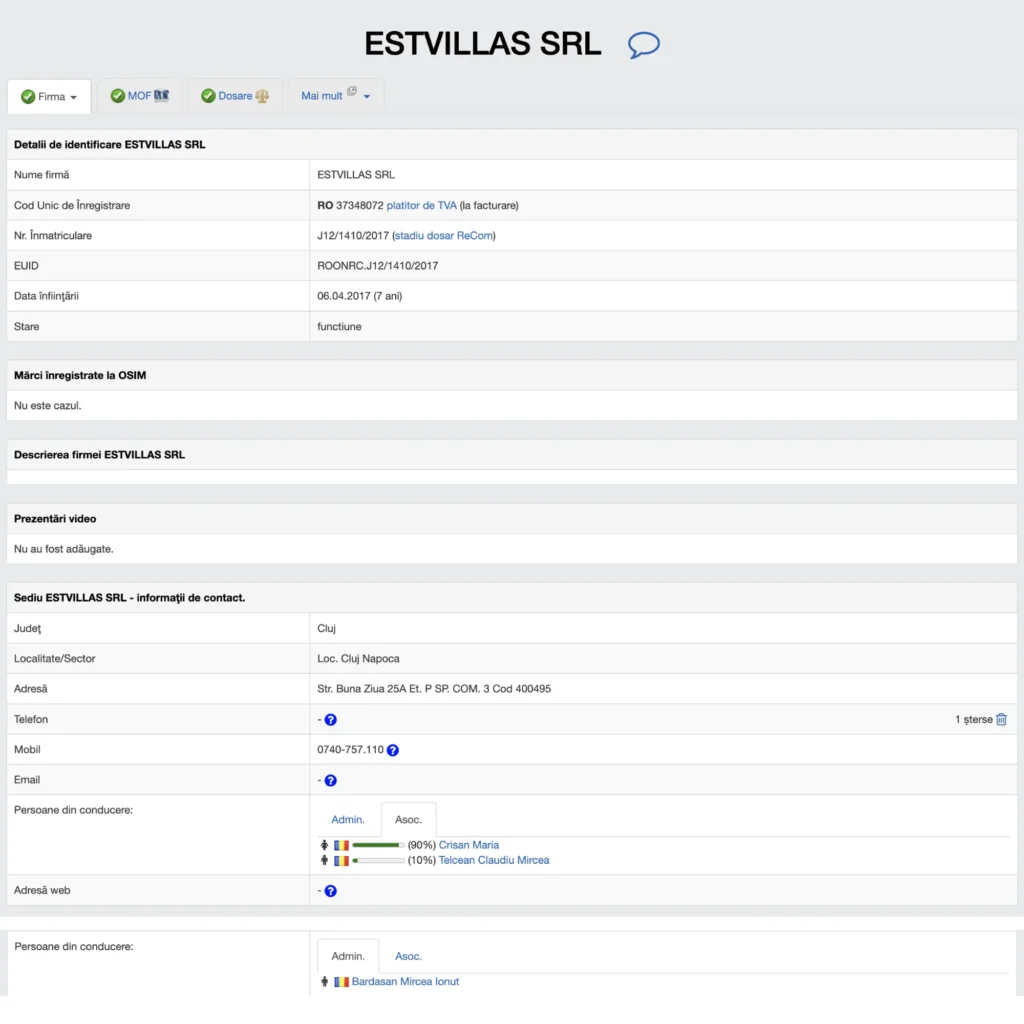 In anul 2017, Bardasan Mircea Ionut a creat o societate comerciala, Estvillas SRL, in care asociati sunt Crisan Maria (mama lui Bardasan Mircea Ionut) si inca o persoana. Administrator cu puteri depline este Bardasan Mircea Ionut. Aceste informatii sunt publice, oricine cu un cont gratuit pe un site de profil le poate accesa, dupa cum se si vede in imaginea alaturata.