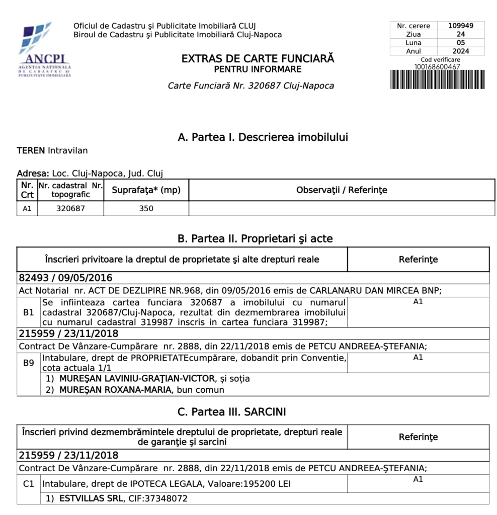 Urmatoarea parcela e cea pe care locuim noi. CF=320694. Aceasta parcela a fost cumparata de la capul locului de catre Crisan Maria, mama lui Bardasan si detinatoarea a 90% din Estvillas SRL. Aici nu sunt evident ipoteci, din moment ce e pe mama parcela, si pe mama si firma. Aici e doar o imputernicire.