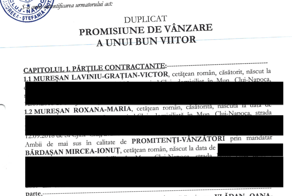 Prima parcela 320687 (care acum e Tarnaveni nr.1) a vandut-o catre Muresan Laviniu. Si-a pus ipoteca dinspre Muresan spre firma lui, si s-a imputernicit pe el sa o tranzactioneze. Astfel ca la semnarea antecontractului tot Bardasan s-a prezentat.