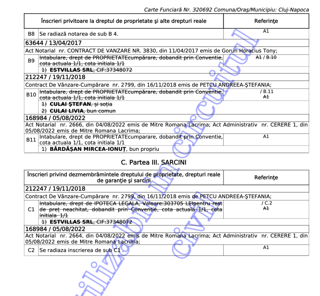 Asadar, cum ziceam aici, noi am cumparat in 2019 terenul cu CF=320694, cladirea ce va fi intabulata pe el, de la Crisan Maria, si 94 din 155mp din terenul cu CF=320693, drumul acela mic dintre noi, de la sotii Culai. Eu nu am vazut niciodata vreuna din aceste persoane. Mereu a fost Bardasan. El imputernicit, el negociator, el tot. La notar el a semnat. pentru toti 3 vanzatori. La fel si la vanzarea casei de la nr. 1.