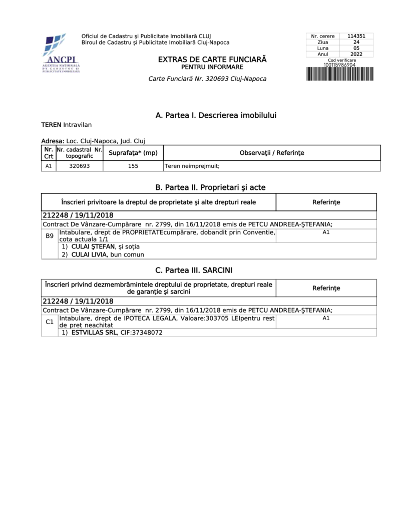 Urmatoarea parcela, 320692 a “vandut-o” catre sotii Culai. Si-a pus evident ipoteca in favoarea lui. In favoarea Estvillas SRL. Ulterior parcela asta a trecut-o pe el, ca acolo sta.