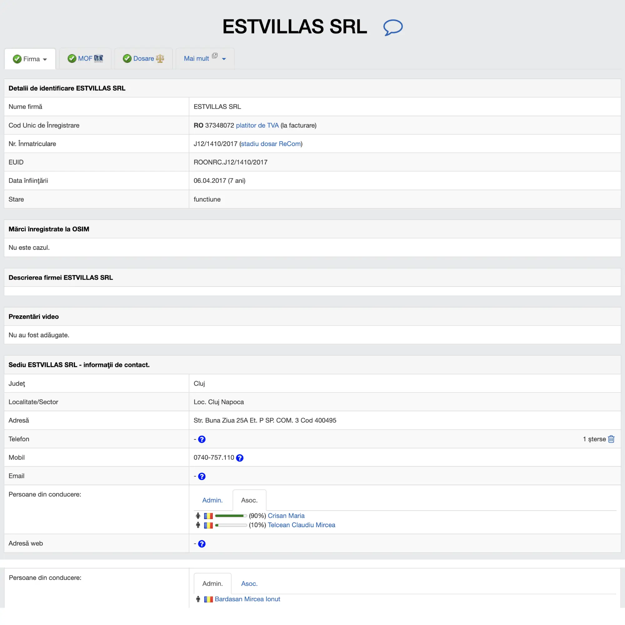 In anul 2017, Bardasan Mircea Ionut a creat o societate comerciala, Estvillas SRL, in care asociati sunt Crisan Maria (mama lui Bardasan Mircea Ionut) si inca o persoana. Administrator cu puteri depline este Bardasan Mircea Ionut. Aceste informatii sunt publice, oricine cu un cont gratuit pe un site de profil le poate accesa, dupa cum se si vede in imaginea alaturata.